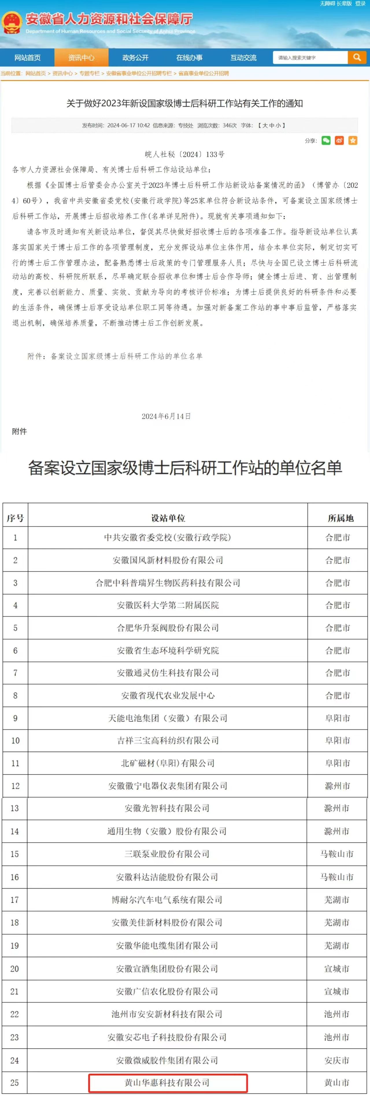 近日,安徽省人社廳發(fā)布《關(guān)于做好2023年新設(shè)國家級博士后科研工作站有關(guān)工作的通知》,25家單位符合新設(shè)站條件,可備案設(shè)立國家級博士后科研工作站,開展博士后招收培養(yǎng)工作。其中,黃山華惠科技有限公司為該批次黃山市唯一一家獲備案企業(yè)。