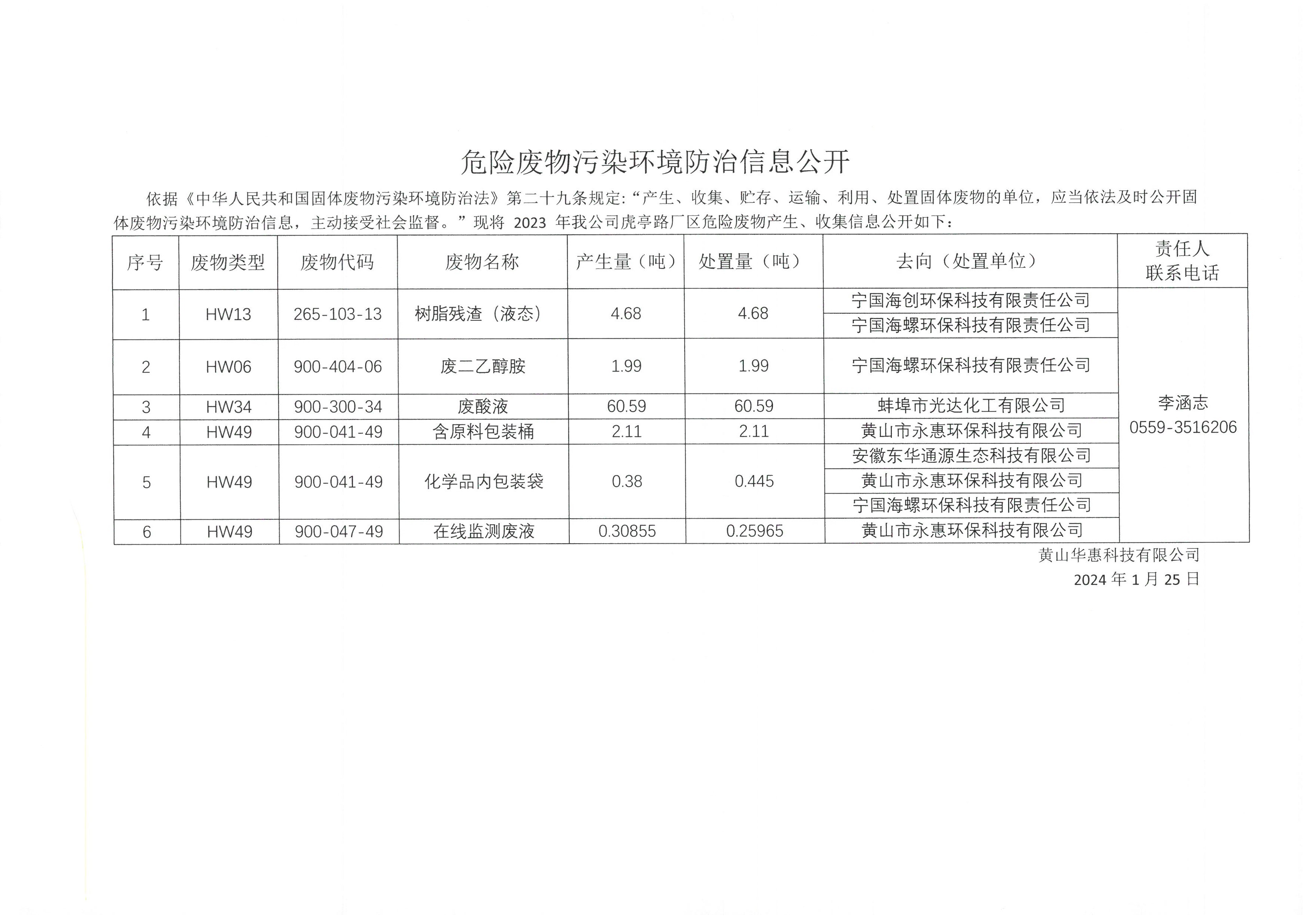 黃山華惠科技有限公司危險(xiǎn)廢物污染防治信息公示